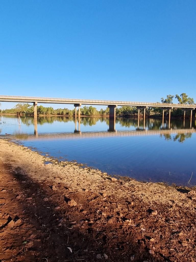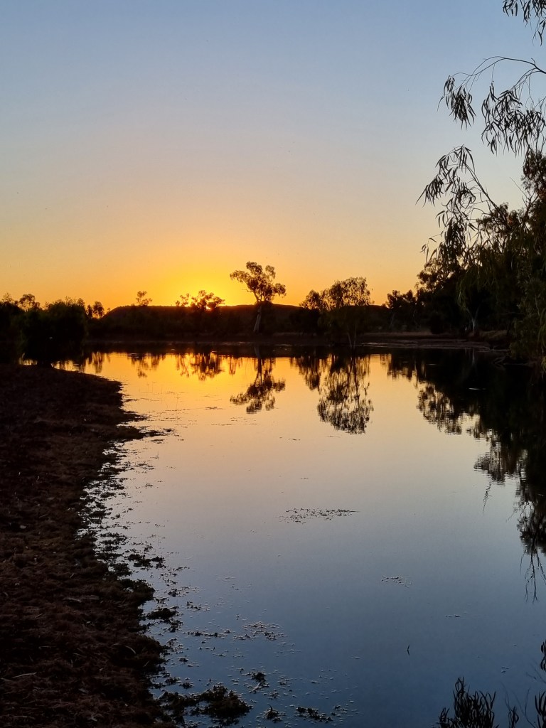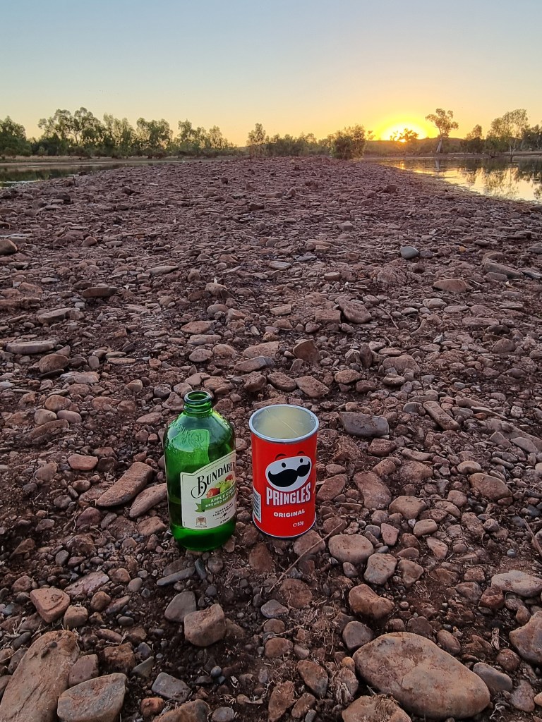 We camped at Robe River Rest Area. We were delighted to find that there was actually water in this river! My knee had been quite sore today. There were many people at the rest area, and they were all interested to talk to us and give us kudos for cycling. It was pretty funny, we discovered that we were doing a similar distance each day to the caravanners. They would pass us a few times because we would start early, and they would start many hours later but then pass us. We got changed into our bathers, grabbed our sundowner ginger beer and pringles, and waded into the river up to our bums (with shoes on for feet protection from rocks). It was a beautiful sunset over the water.