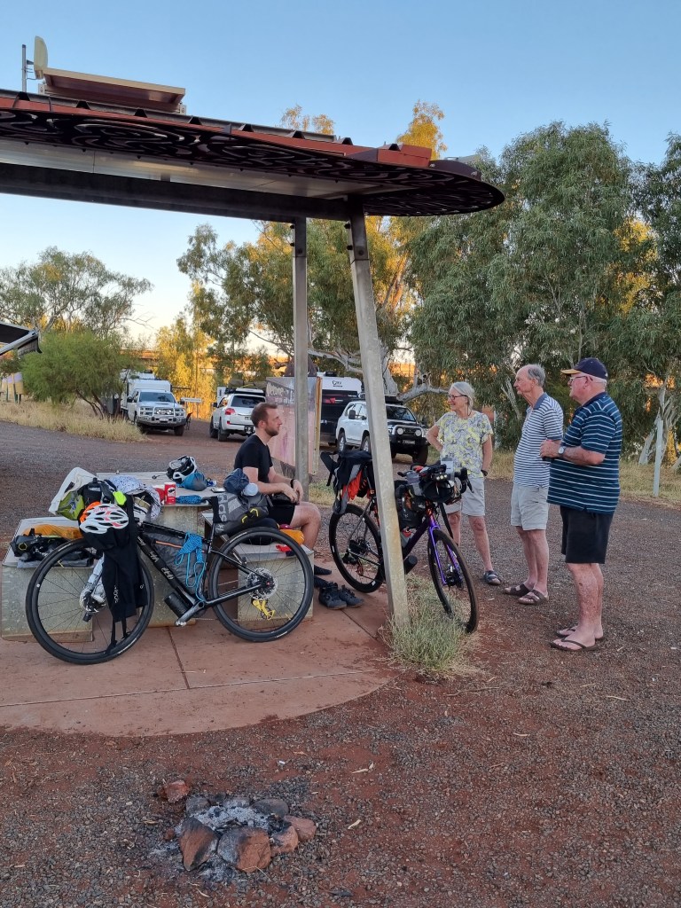 Slowly it started to fill up with caravans. A lovely lady in a mini teardrop caravan stopped in the shade near our table. We had lots of chats with her – she had done bike touring in Tassie in her younger days, but now did caravanning with her dog. Like many caravaners, she lived in Mandurah and gave us some mandarins carried from her garden and topped up our water supplies. We caught up on some trip notes and spent most of the afternoon chatting, followed by an early dinner and early bed – setting up our bivvies on the concrete under the shelter.