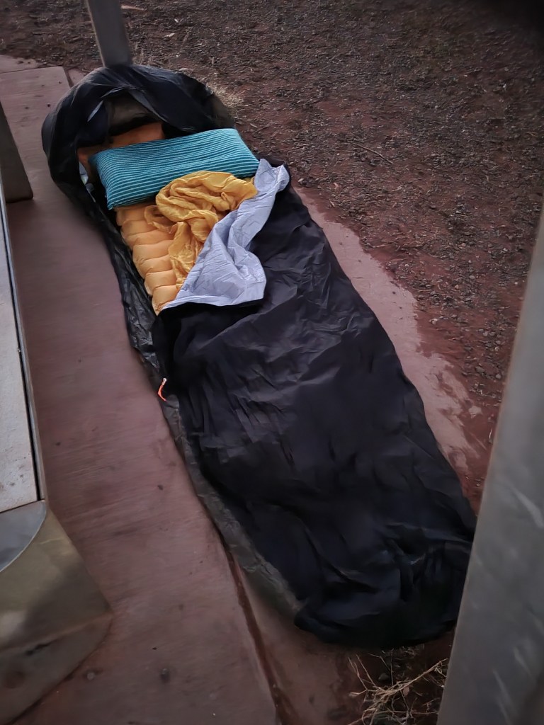 By about 4pm the heat became more manageable and I started to appreciate my surroundings again, including some pretty orange and green birds in the shrubs. We rode through the sunset and reached Stanley Rest Area shortly after dark. We claimed a table on a concrete platform under a shelter, got changed, and prepared dinner – a packet of pre-cooked rice, foil packets of tuna, a small tin of corn, and an avocado between the two of us. I set up my bivy and settled in, but unfortunately sleep was intermittent – possibly due to the unfamiliar (first night in the bivy for the trip) or possibly the heat and long day had left too much adrenaline or stress in my system.