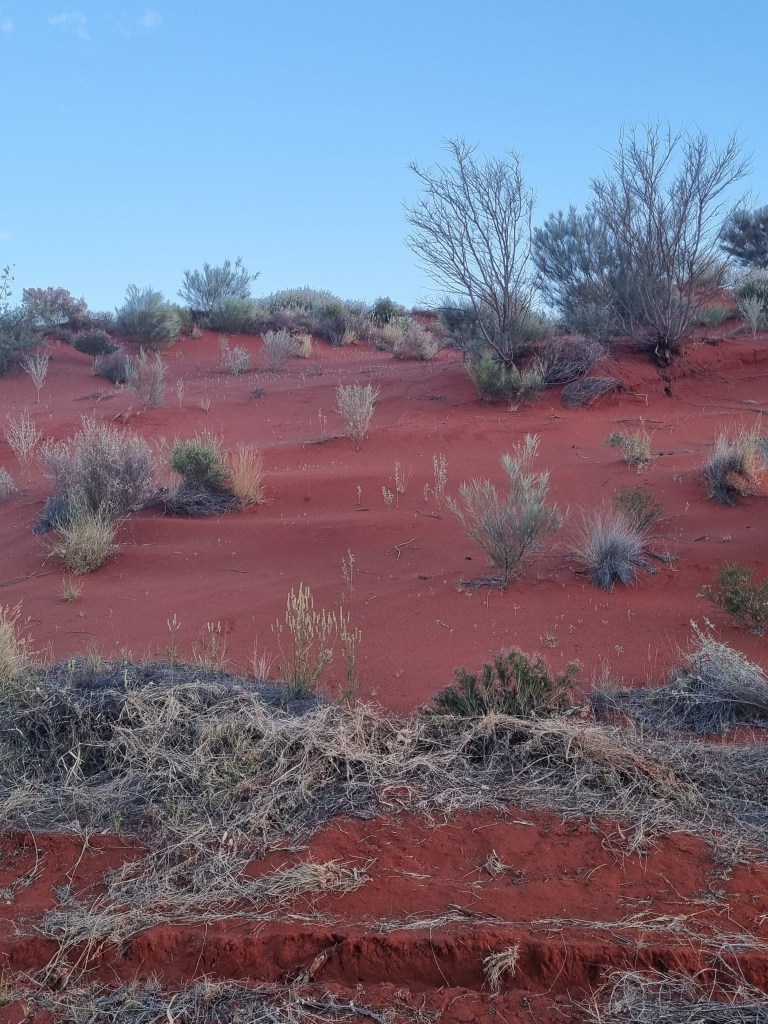 It was another special sunrise this morning, behind us today as we were heading west. We crossed numerous mild undulations, up and over red sand dunes. We seemed to reach the turnoff for Exmouth and Coral Bay quite quickly (thanks to a tailwind), and we crossed into the Gascoyne Region.