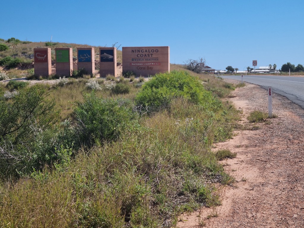 It was getting hot and I was getting tired. The coastal vegetation was super low which meant no shade. At least we managed to have a tailwind practically all day, until we turned right for the final 12km stretch to Coral Bay. Then it was a block headwind, obviously the sea-breeze had come in. As it was the last stretch, I was motivated to finish and got through it ok. We saw glimpses of the sea, then finally the entrance signs for Coral Bay. We were here!