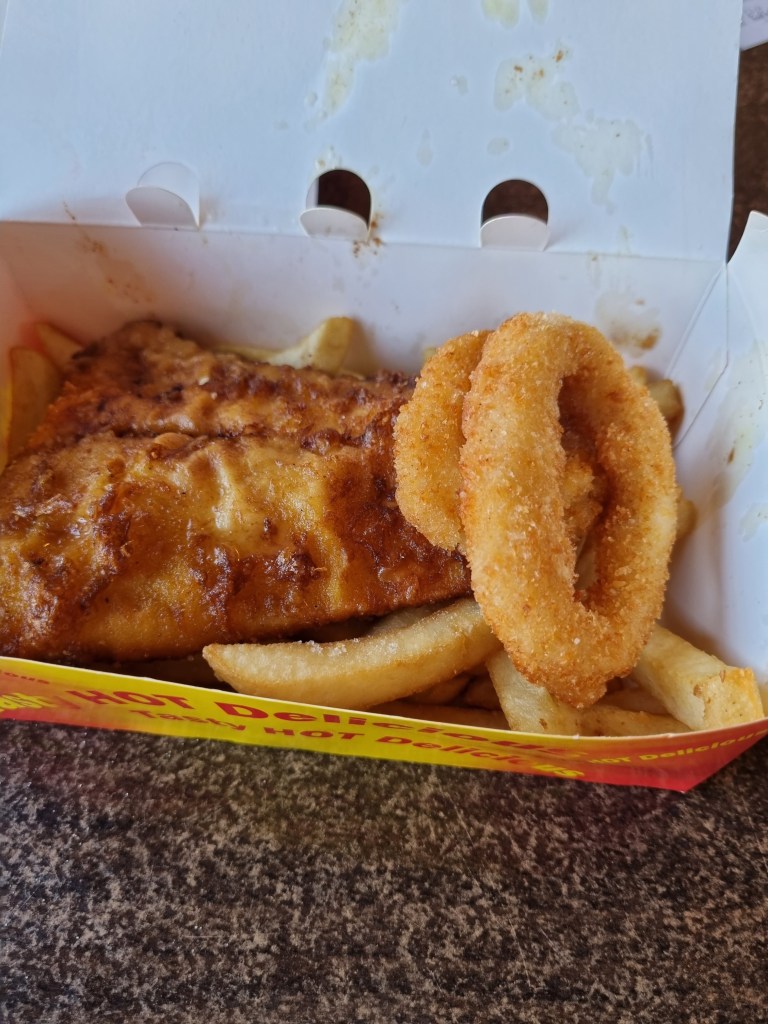 We made a beeline straight to the bakery. I got a vanilla slice – actually, I got two, as they had a 2-for-1 special, so Greg also got to enjoy a vanilla slice. It was the first one of the trip and was very very good. We then checked into our villa at Ningaloo Coral Bay (Bayview), which was very nice with fancy amenities like a couch, shampoo AND conditioner provided. We donned our bathers and had a quick swim in the caravan park pool, but it was full of kids jumping and splashing so that was short-lived. We did all of our washing so that we wouldn’t have chores to do tomorrow, then wandered down to see the beach and explore the other caravan park shops. We grabbed an early dinner of fish and chips and squid rings (pre 5:30pm) but sadly when we tried to buy single cans of beer at the bottle shop we were told it was six-packs as a minimum. We did not want a six-pack and I didn’t want to be wasteful spending money we didn’t need or buying water in a bottle or a large bottle of soft drink when the tap water was perfectly drinkable. So we enjoyed our very very good fish and chips with tap water and were happy.