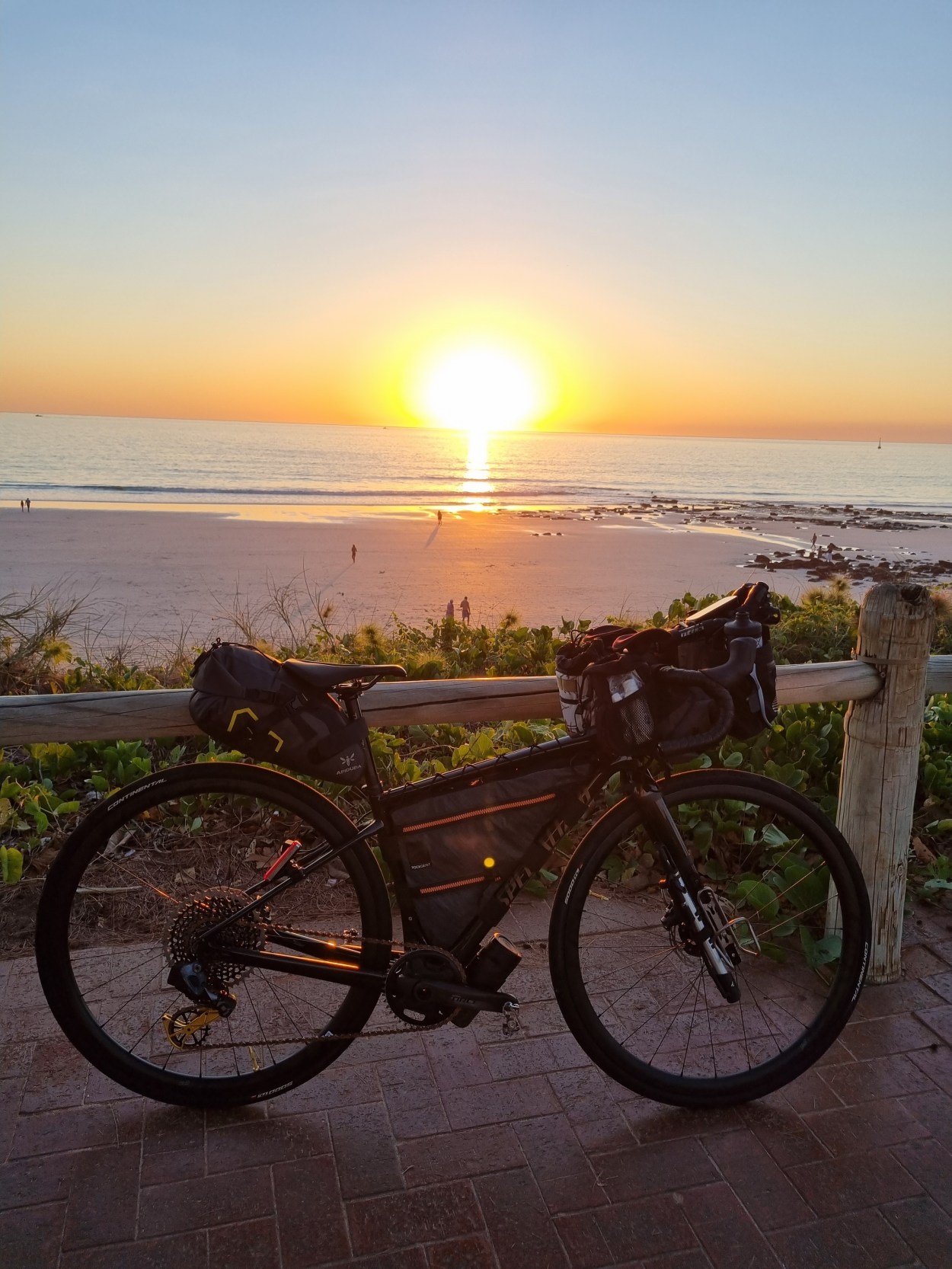 In the tradition of ultra-endurance race events, the RideWA route started at the ocean. On Sunday, we rode from our hotel through suburban Broome to Cable Beach, arriving in perfect time for the sunset. We were very happy to be on bikes, as the car park was chockers! After many snaps of the bikes and beach, we paused to enjoy the sunset then rode the first 5km of the RideWA route, before heading back to the hotel for dinner.