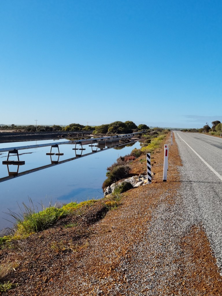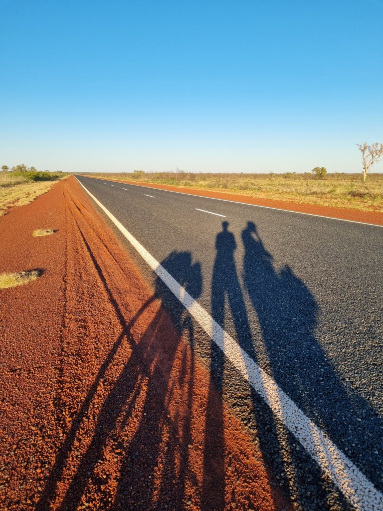 Emma: The heat on Day 1 was over 40 degrees out on the road – I had to stop about every 30-40min in the hottest hours of the day as my heart rate climbed and my head got vague. The heat didn’t diminish on subsequent days, but we adapted or rested during the hottest part of the day. On the third day, the last 15km or so into Port Hedland were into a head wind, we had been riding long days in the heat without much sleep, and I was done in. We made it to our lunch stop at a crawl and I was thankful for Greg’s help in ordering drinks and lunch. This was the only time I really struggled to maintain forward momentum on the bike. There were two days with 100km long stretches impacted by winds – from Robe River Rest Area to Nanutarra we had a strong cross-head wind, and from Carnarvon to Wooramel Station it was a strong headwind. These were both tough stretches that were endured only with the distraction of audiobooks and knowing that there was an end in sight. I also had terribly annoying mozzie bites for the first week.