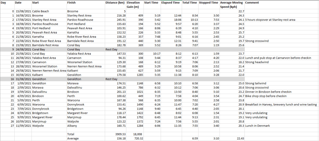 Key stats for each day are presented below. In summary, we did a total of 3,900km over 27 days, including 2 rest days. This was an average of 160km per day for the 25 riding days. Our average speed across the entire trip was 22.4kph, with an average daily riding time of 7 hours (moving time) and about 3 hours stopped time.